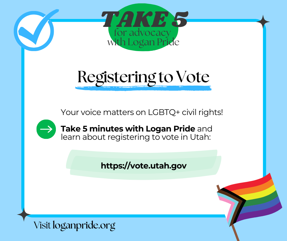 Your voice matters on LGBTQ+ civil rights! Take 5 minutes with Logan Pride to learn about registering to vote in Utah: https://www.equalityutah.org/take-action#register-to-vote.